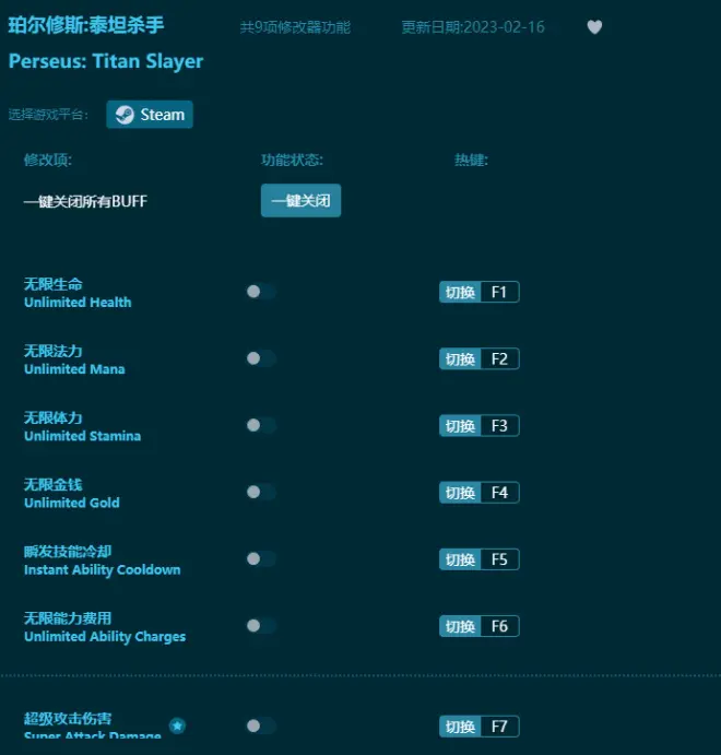 【GameBuff】珀尔修斯:泰坦杀手修改器九项修改器功能,支持无限生命,无限法力等