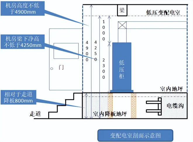 ◆ 若高低压室合用,此机房高度不低于5000mm,机房梁下净高不低于4350mm;