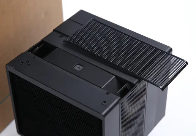 隐藏在塔体中部磁吸式金属网板顶盖下方的风扇是1把140mm规格的正叶扇,通过一对快拆卡扣固定在两块散热塔之间。这把140mm规格的风扇在全速运行的模式下,最大转速可达1700RPM,最大可提供79.1CFM的风量和2.44mmAq的风速风压。而在安静模式下,这把风扇最大则可以达到1350RPM的转速,最大可提供63.76CFM的风量和1.58mmAq的风压;