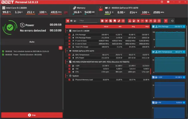 OCCT双烤测试,CPU最大功耗220W左右,显卡最大功耗215W左右,整机最大功耗为450W。