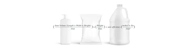 单位效率计算为(每单位立方体积)x(每单位重量)。该指标使我们能够计算产品交付单位数量的体积和重量利用率。在这个等式中,较低的单位效率值意味着更高效的设计。例如,与非浓缩洗涤剂相比,浓缩洗衣粉可以以更小的体积和重量提供相同数量的单位(负载),从而提高单位效率。
