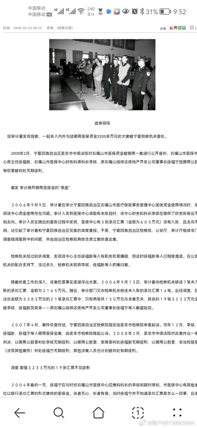 宁夏恒大中小企业担保有限公司,是他们经过合并后屠国军任领导,但他们的账户在商行,屠国军曾是商行行长,宁夏银行是倒闭包商银行第五大股东。投资大厦是宁夏中房物业,也是他们投资,证监会王益涉及太平洋证券案件,该证券当年就位于投资大厦楼上。而他们楼下的奥体花园,又牵涉薄熙来案,该案主犯之一于俊世就居住位于重庆的楼盘中,他放狼狗咬死过路人,被判刑。 他们贴承兑汇票盗用我的公司账户。汇票来自上市公司美利纸业,就是现在的美利云。收款人是美利纸业位于巴彦淖尔的分公司,负责人孙慧宗。 当时我公司有经营所需专用贴现账户,他们已经在银行贴现了7000多万,来自很多上市公司,其中有青岛双星。而我并不知道他们的违法违规目的,只是银行说帮助背书下,因为公司业务在工行贴现中心,没想到他们贴现到公司账户中,并私自转出。没有任何贴现必须的资料,真实往来的合同,增值税发票复印件,票据核实真伪查询通知签字确认,公司同意文件。大笔金额转出授权签字确认,连转账支票,银行进账单我都不知道谁填写的? 我是私营公司,从事贸易往来,但不从事贴现中介,当时这里发生石嘴山医疗保险案,他们把8000多万医疗保险金贴现投资使用,并私自侵占3000多万,用于投资个人房地产公司,买奢侈品,汽车,住房。主要是煤矿医保金。石嘴山检察院就在工行查账。我就要求他们查账了,其中一笔30多万就是公司往来发生,但他们都转走,对方开户也是商行新华街支行。来自他们案件审理中另案处理的李某,就是天成房地产公司职员李莉,回族,她给她妈买房装修花了80万,个人买了万达广场公寓两套,汽车一部。 我后来去工行西城支行要求查阅他们贴现资料,要求复印,他们说啥都没有。赖小民的华融公司,中融信托都在他们楼上办公,院子门口有很大牌子。我不想被这些烂事牵扯进去,就在法治新报发了公告声明。 这家担保公司是法院指定的合作单位,但通常的诉讼是提供保函担保,对确定标的担保,没有任何必要贴现,即使诉讼保全担保,也是打保证金进法院账户,像这样的票据来自上市公司美利纸业,就是诉讼保全担保,也应在法院专用账户进行贴现业务,开一个贴现账户属正常业务,这是违规非正常业务往来。