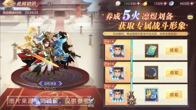 在【此间初识】模块中,本次活动将会开放「凛煜刘备-限定款战斗形象」,并可在该模块中进行试玩,该活动奖励可在「凛煜刘备」的觉醒等级培养至目标等级时获取!
