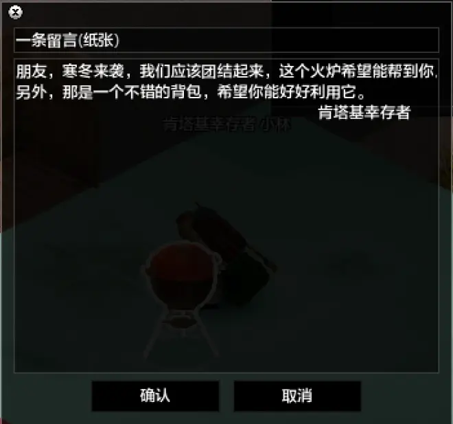 从最早的勺子与小熊橡皮糖的交易、到送到我门前的瓶装水;然后有人帮我封上了窗户,送来物资;再然后,有人帮我建立楼梯,提供了一些可以准备过冬的物资。