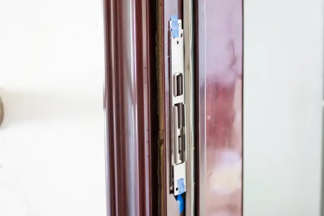 小米安装师傅的方法是先将边条用胶布固定住(我图中已经是完成安装状态,所以只能再找个边条演示一下),然后反复调整边条横向的位置,反复测试不同力度的关门,是否可以卡住锁舌,如果力量大一点就关不上门,边条就再向门外挪一点,等确定好了位置,再下铆钉。有一说一,小米的安装确实很专业,很多原理都能讲得很清楚。