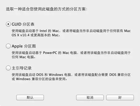 将准备好的 8GB 容量 U 盘插入 Mac,并确保系统已经识别出该 U 盘。启动磁盘工具(按快捷键ctrl+空格,然后输入”磁盘工具”——回车),在窗口左侧选择插入的 U 盘,点击右侧的分区,分区布局选择”1个分区”,然后点击下面的”选项”,选择 GUID 分区表,然后点击”好”——”应用”,开始分区并格式化。