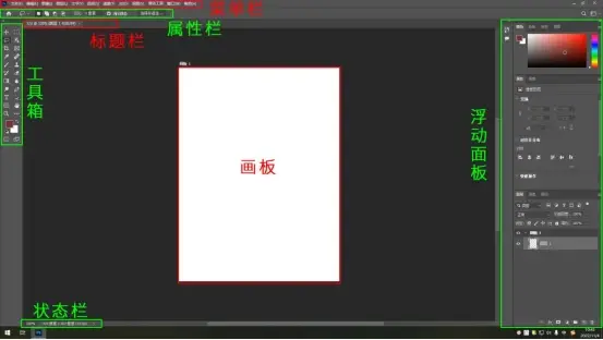 2、能区分出PS界面中菜单栏、属性栏、标题栏、工具箱、状态栏、浮动面板、画布的大概位置。