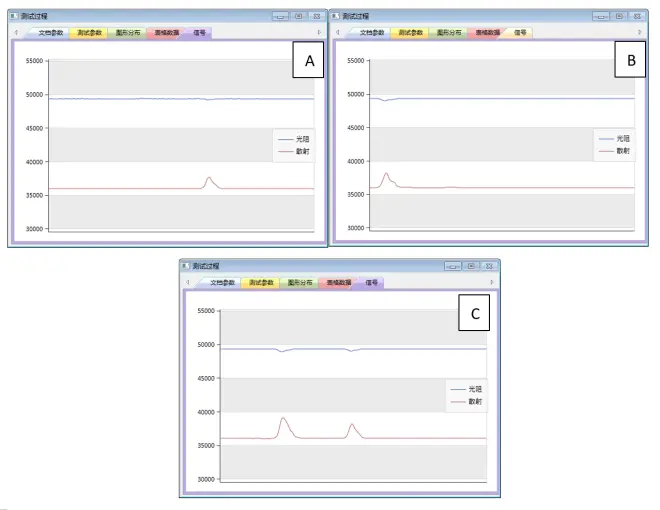 本次试验测试了A、B、C三种脂肪乳,由于脂肪乳注射液浓度较高,测试时需要将样品做相同倍数的稀释,测试过程信号曲线(局部)如图3所示。