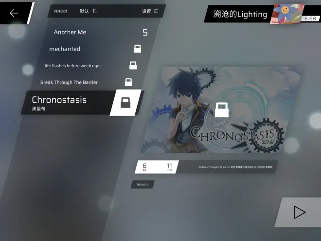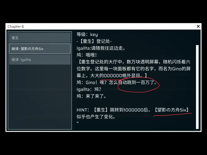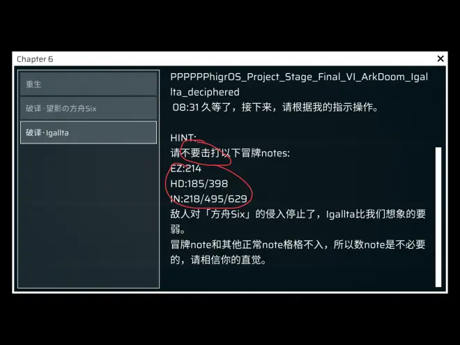 然后玩「望影の方舟Six」,不要击打速度略慢的冒牌note,便可解锁第七章