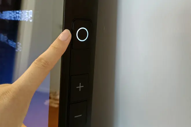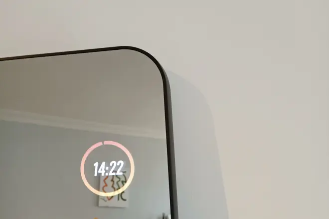 外形上,它看上去就是一面质感满满的镜子,铝合金一体成型的金属边框,曜石黑的配色,摆在家里当做穿衣镜也极具美感和质感。