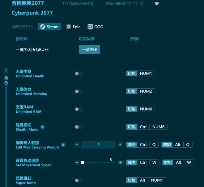 赛博朋克2077是款备受玩家们好评的赛博朋克风RPG游戏,但是不少玩家在试玩以后发现游戏难度略大,因此十分容易卡在一个地方过不去,那么这时就可以配合本站的赛博朋克2077修改器来进行游戏体验啦,这是专门根据同名游戏而制作推出的一个游戏辅助工具,并通过使用它可轻松的帮助玩家修改获得游戏中43项无敌属性,十分强大。而且该工具使用也是十分的简单,只要先依提示进行安装,接着先运行游戏,再打开赛博朋克2077修改器就会发现界面上提供了许多的键位,然后再进入游戏根据键位来进行操作即可轻松的在游戏中开启角色属性增强、弹跳伤害最大、跳弹伤害重置、暴击率最大、暴击率重置、护甲最大、负重最大、超级速度、子弹时间、生命重置、角色无敌等多种三十二项修改,从而可以大幅度的帮助玩家降低游戏难度,更好的享受游戏,再也不用担心会卡关。