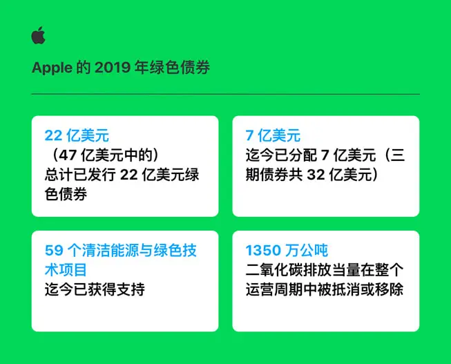 为在全球各地加速推进清洁能源进程和环境创新,Apple 总计 47 亿美元绿色债券承诺中迄今已有超过 32 亿分配完成——包括其前两期总额 25 亿美元的债券。到目前为止,Apple 已从 2019 年 47 亿绿色债券中拨款 7 亿美元支持 59 个项目,包括中国清洁能源基金、为供应商开发及分配清洁能源培训资源,以及在日本、越南和韩国的合作宣传工作。