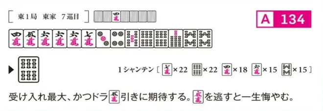 注意到保留8m(连续型的dora筋)有dora 5m雀头进张、四连型靠张,所以不优先考虑切8m。0s本身是dora,而且形成了4440s的三面待,也不会动。那是不是应该切8s呢?并不然。切8s有18枚的4679m467s好型进张,16枚的358m35s愚型进张,且很多好型进张需要切掉0s,不仅丢了dora,还失掉了平和。
