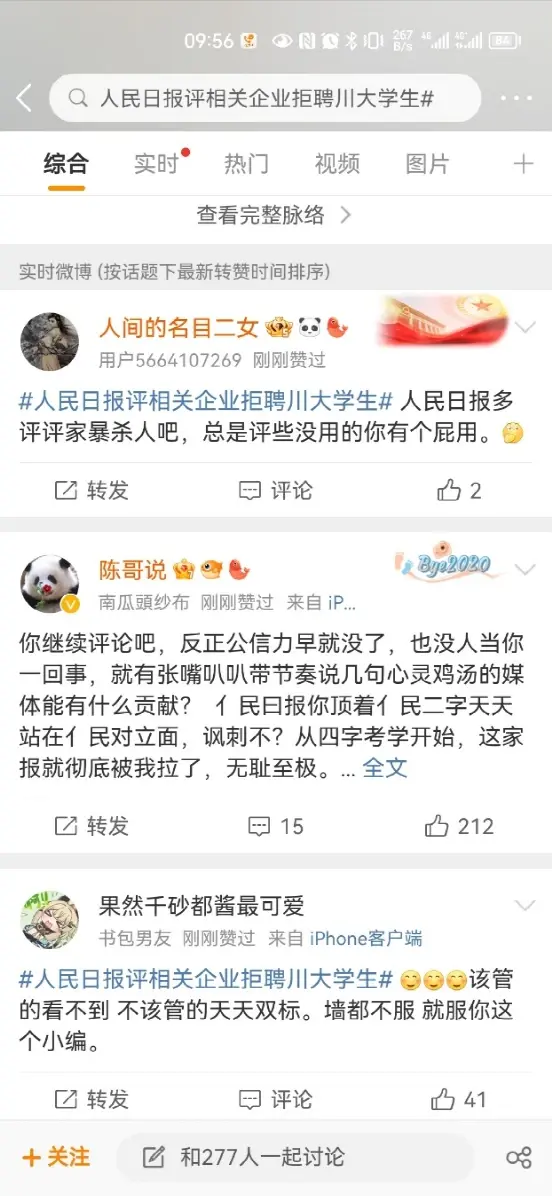 上午,“人民日报评相关企业拒聘川大学生”的话题,一路攀升,登上了热搜榜第4位。