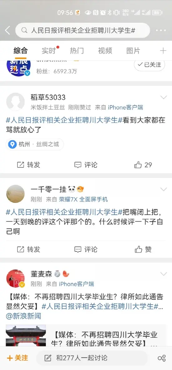 6月27日,人民日报评论发布这篇文章后,原本的数据并不是太热。直到28日上午,粉丝6500多万的官方账号“新浪热点”,以主持人身份,将这篇小稿运营话题#人民日报评相关企业拒聘川大学生 ,而后迅速上榜热搜,并一路冲到第四的高位。