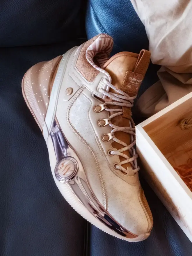 鞋身部分大面积的香槟金配色搭配鞋身部位的特殊纹理,彰显出极为高级的质感表现。另外,球鞋前掌TPU模块的金属镀铬质感,更是彰显了总冠军的荣耀感。