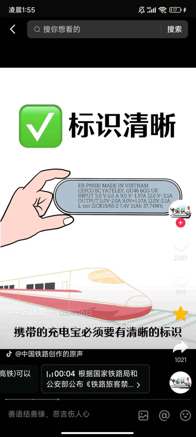 出处:1.71 LJi:/ 复制打开抖音,看看【中国铁路的作品】注意咯!乘坐火车什么样的充电宝不能携带? https://v.douyin.com/iJ8vGngm/