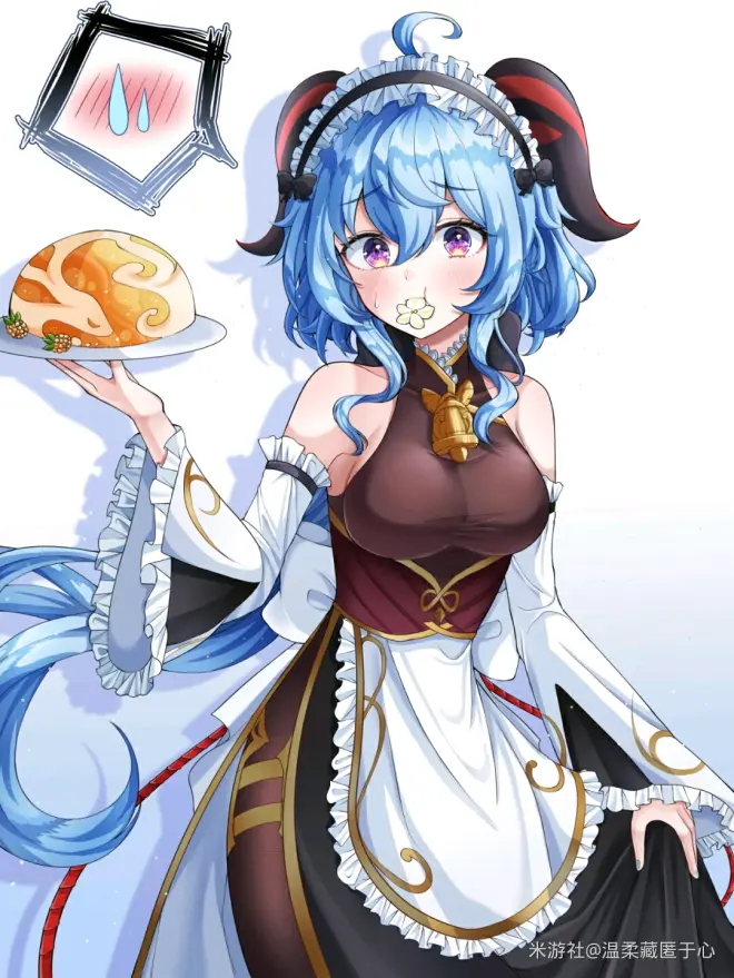 一名蓝发少女走在漫天黄沙中,背上一把蓝白相间的弯弓,头上一对漆黑的犄角格外明显。