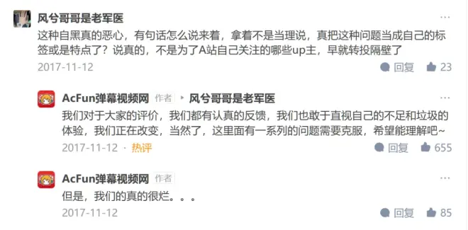 在那个时间段,AcFun的官方号都在知乎上吐槽,自家的视频网站客户端是真的烂,还叫大家不要跟自己“比烂”,其他人是比不过的,别有一番黑色幽默。