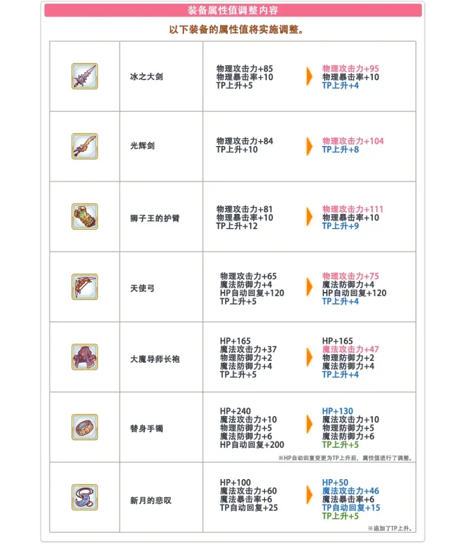 若以更新前的属性值来搭配品级加成(Rank Bonus)的登场,则特定角色的TP上升会大幅提高,并就结果而言会使得品级加成(Rank Bonus)的价值发生不均的情况,因此将对已经登场的部分装备道具的属性值进行调整。