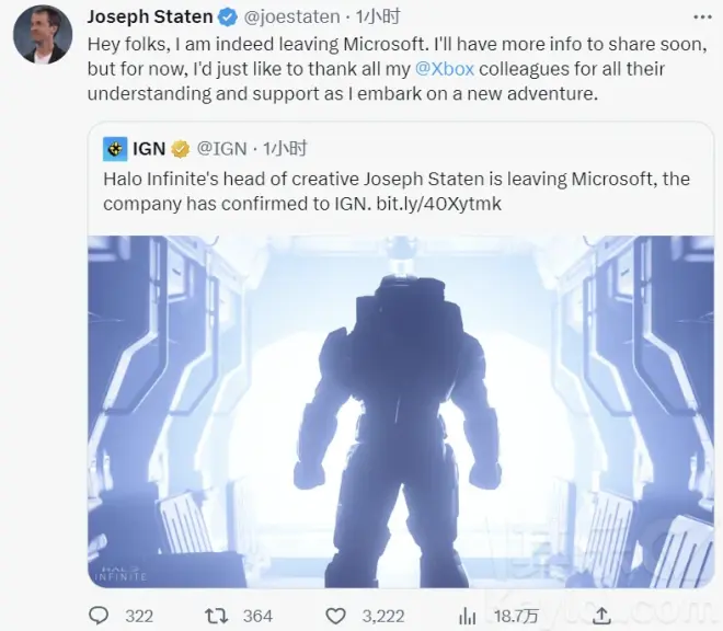 《光环:无限》前创意主管 Joseph Staten 正式离开微软。先前彭博社在 1 月的报道声称其只是离开了 343 indsutries,回到了 Xbox Game Publishing,现已彻底离开整个微软集团。