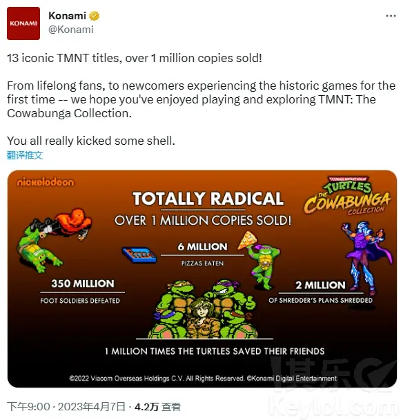 北京时间昨晚,发行商科乐美宣布:《忍者神龟:卡哇邦嘎合集》销量已突破100万份。