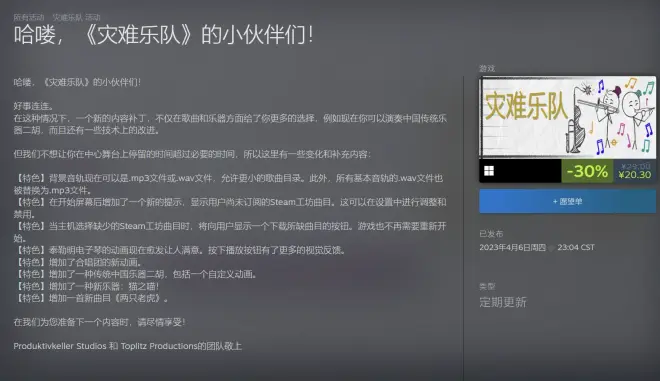 1、节奏游戏《灾难乐队》增加传统中国乐器二胡和新曲目《两只老虎》