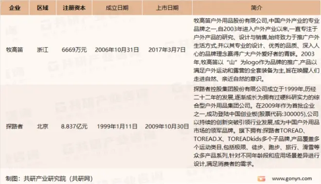 我国帐篷生产企业众多,其中上市企业主要有牧高笛、探路者等,牧高笛户外用品股份有限公司,中国户外产业的专业品牌之一,自2003年进入户外产业以来,一直专注于户外产品的研究、设计与销售,始终致力于推广户外生活方式,并以其专业的设计、优秀的品质、深入人心的品牌理念赢得广大户外爱好者的青睐。2003年,牧高笛以“山”为logo作为品牌的推广,产品以满足户外运动和露营的全套装备为主,旨在唤醒人们走进自然、亲近自然的意识。探路者控股集团股份有限公司成立于1999年,历经二十二年的发展,逐渐成长为拥有过硬科研实力的综合型户外用品集团公司。在2009年作为首批企业之一,成功登陆中国创业板(股票代码:300005),公司以持续的创新突破引领行业发展,成为中国户外用品市场的领军品牌。旗下拥有:探路者TOREAD、TOREAD.X、TOREADkids多个子品牌,产品覆盖多个运动类目,包括极限、徒步、跑步、旅行、滑雪等众多产品系列,针对不同年龄段和应用场景差异进行设计,满足消费者的需求。