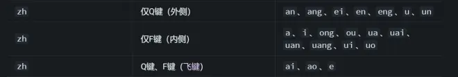 表中的意思是说,我们以音韵的形式打字,韵母 ai 、ao 、e 的情况,Q还是F,都可以,只有前面两行的韵母需要区分。