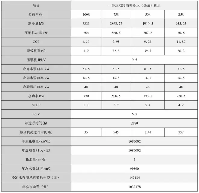 本项目空调系统总冷负荷为3821kW,现针对夏季制冷方案进行技术经济分析。此处选择蒸发冷却(一体式双冷高效冷水(热泵))机组与传统机房系统进行对比。
