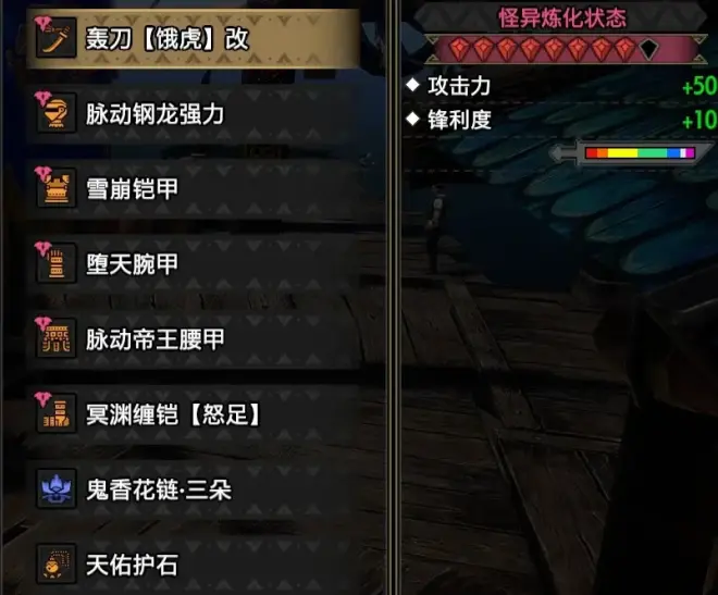 怪异槽扩充Lv6(攻击力+30、锋利度+10)+攻击力强化Lv4(攻击力+20)