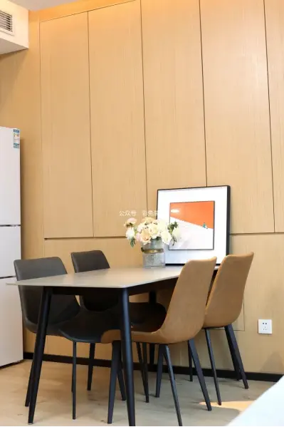 餐区墙面用原木色面饰板硬包墙面,墙板的长方造型,起到拉伸视线的效果,让空间看上去更显修长。木质的细腻纹理,柔和触感,提升了家的品位。