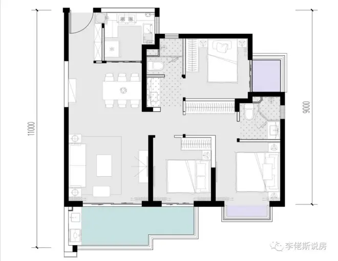 优点:户型方正、动静分区,客厅大阳台 缺点:中户连廊,厨房、客卫二次采光,采光不足,南北通透不纯粹。 118㎡(端户):三室两厅两卫双阳台;