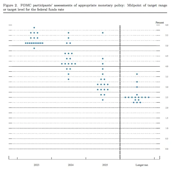 而这次会议也公布了最新的点阵图,显示2023年的终端利率会升至5.1%,预言2024年利率会降至4.3%!