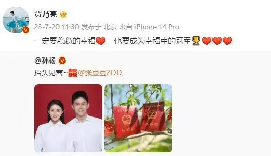 7月20日,奥运冠军孙杨突然发文宣布了一个好消息,那就是他和“体操女神”张豆豆结婚了,网友们对此惊讶不已。据悉,孙杨率先在社交平台上面晒出结婚照,艾特了张豆豆并配文“抬头见喜”。