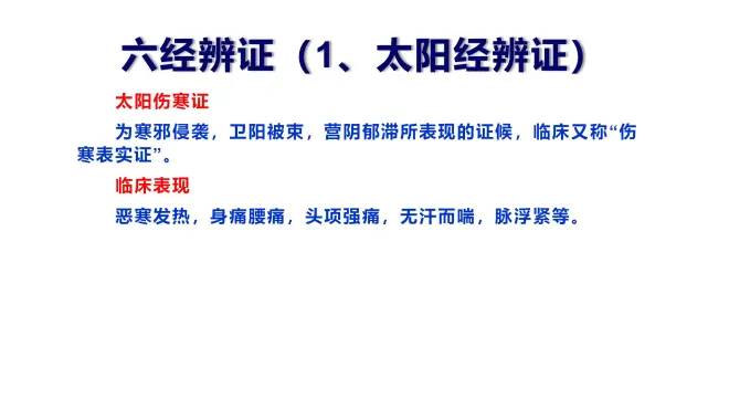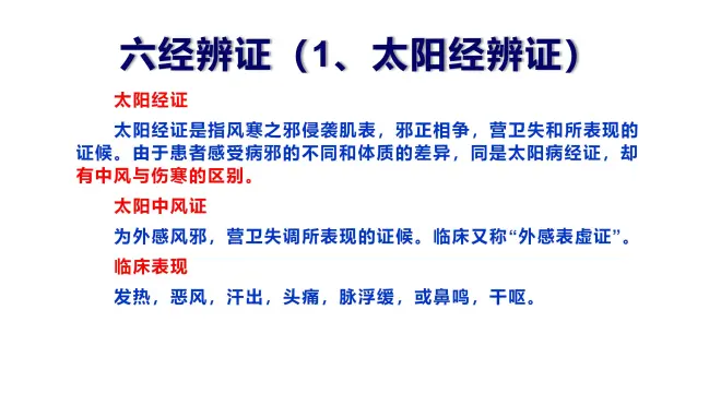 太阳经证是指风寒之邪侵袭肌表,邪正相争,营卫失和所表现的证候。由于患者感受病邪的不同和体质的差异,同是太阳病经证,却有中风与伤寒的区别。