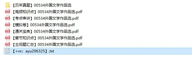 00534外国文学作品选自考复习资料内容包括章节知识点、意向考点串讲、题库(模拟卷)、主观题、通关宝典和2003-2022年04月00534外国文学作品选历年真题(真题会持续更新,部分考卷可能会没有答案)。