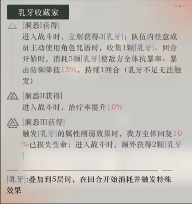 天赋在洞悉一获得的效果极其强大,我方每使用5次角色咒语就可以不占用行动点给予敌方全体抗暴率和暴击防御减15%的debuff,这样的效果在回合制游戏中往往都非常强大,1999也不例外;[乳牙]降低敌方全体15%抗暴率和暴击防御,折合期望增伤7%~15%。