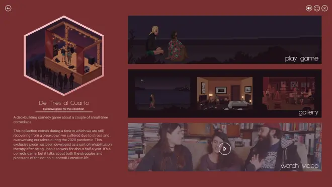 一部 Deconstructeam 在寻求全新的叙事游戏体验方面的出色尝试的精选集。探索10个独一无二、非同寻常的故事,其中包括了“De Tres al Cuarto”——一场选集独占的崭新短篇体验,讲述了一对三流喜剧演员试图出名的故事。
