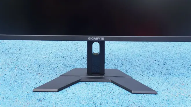 技嘉G27Q电竞显示器组装上很简单,只需要将底座对准支架并上紧螺丝即可,从下图也可以看到,支架部分有预留导线孔来方便用户走线,孔位高度不算高。