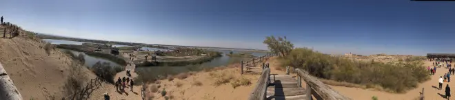 前人曾对黄沙古渡繁忙有所描述:“河流东下自昆仑,浊流排山晓拍津。来往行人喧渡口,只因名利少闲身”,黄沙古渡周围的黄沙与绿野,烽火台与万里长城,黄河与渡船,滩渚与芳草,戍卒与渡客,构成了一幅独特景色的塞外风光。