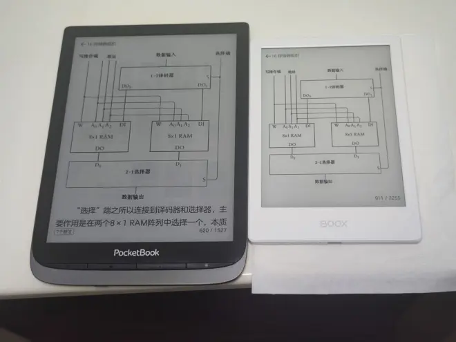 屏幕给我的感觉就是暗,太暗了!虽然买之前也有了解过彩墨屏,但是仍然难以接受。下面是我拍的一张照片,与文石 poke 4s 在室内开顶灯的情况下的对比。这种场景,我之前用 poke4s 都是不开前光的,但是使用 PocketBook 阅读我觉得必须得开启前光。当然不开也行,是可以看清文字,但是很难受,由于眼睛需要长时间聚集以看清内容,很容易疲劳,减弱护眼的效果。