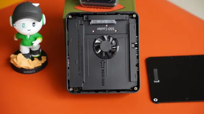麻雀虽小,但五脏俱全,下面我们给零刻SER5 Pro做个简单的拆机来看看他的内部构造,拧掉底部的斯克螺丝,一拉塑料拉手就可以看到内部安装硬盘的部分,同时还给硬盘配置了一个散热风扇。不过这个扇热风扇除了可以给额外新增的硬盘散热,同时也可以给主板上的固态硬盘散热,这个设计很合理啊,空间一点也不浪费了。