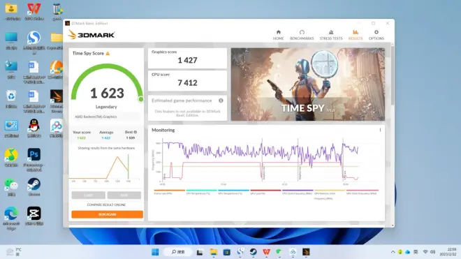 看到这里其实我们对零刻SER5 Pro迷你主机的整体表现已经有了整体认知,不过这里我也使用了大家熟悉的3D Mark对其进行的测试。3D Mark的测试测试成绩中AMD Ryzen7 5800H CPU成绩为7412分,GPU成绩也达到了1427,而基本接近满帧测试的过程中温度也分别为78.5℃和63℃,可以说性能与温度的控制比较均衡了。