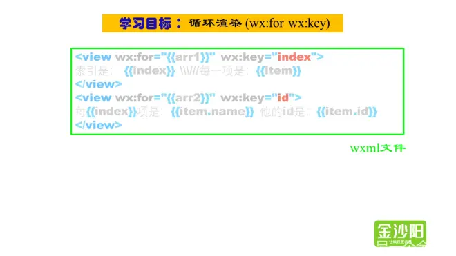 我们把刚才在js文件里面准备好的东西渲染或者用人话说就是展示到小程序上。注意了,我们要把这个wx:for属性给用上,等于号后面跟着的是双引号下面的双大括号,这个是以前我们讲过的mustache语法,我们把数组以及列表的名字安排上,arr1和arr2,后面呢我们要跟上一个wx:key属性,这个呢是微信开发的强制性规定,用来提高循环性能的,对于数组呢,我们就用默认的index,对于列表呢,我们就把其中一项的名字放上去就行了,注意了这里不能用mustache语法了,用引号就可以了。