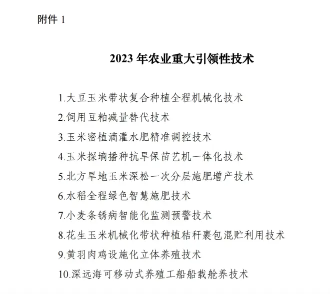 为深入贯彻落实党的二十大和中央农村工作会议精神,发挥科技对提升全国粮油等主要作物大面积单产的支撑作用,加快优质品种和先进适用技术推广应用,满足当前生产急需和未来产业发展需要,农业农村部组织遴选出2023年农业重大引领性技术10项、主导品种143个、主推技术176项(见附件),现予推介发布。