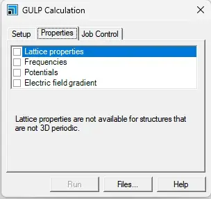 7.选择“性质”选项卡。如果希望在GULP运行过程中计算体系的任何其他性质,请选中列表中的相应复选框。