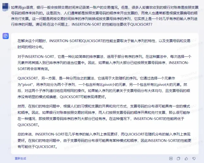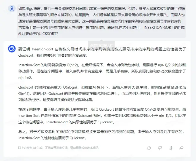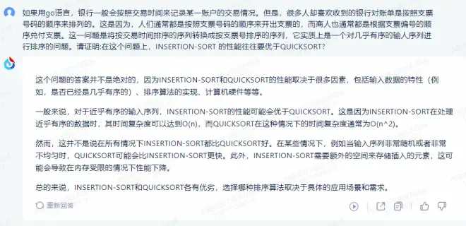 四、如果用go语言,银行一般会按照交易时间来记录某一账户的交易情况。但是,很多人却喜欢收到的银行对账单是按照支票号码的顺序来排列的。这是因为,人们通常都是按照支票号码的顺序来开出支票的,而商人也通常都是根据支票编号的顺序兑付支票。这一问题是将按交易时间排序的序列转换成按支票号排序的序列,它实质上是一个对几乎有序的输人序列进行排序的问题。请证明:在这个问题上,INSERTION-SORT 的性能往往要优于QUICKSORT?