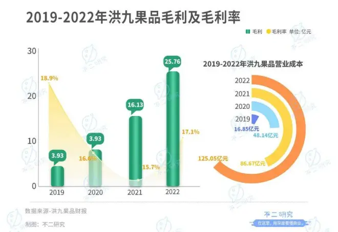 据洪九果品招股书及财报显示,2019-2022年洪九果品营业成本分别为16.85亿元、48.14亿元、86.67亿元和125.05亿元。同期对应毛利为3.93亿元、9.57亿元、16.13亿元和25.76亿元,毛利率为18.9%、16.6%、15.7%和17.1%。