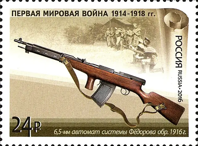 上图是俄罗斯印制的邮票,面值24卢布,邮票上印制的是费德罗夫自动步枪,由费德罗夫在1915年设计制造,是历史上第一批自动步枪之一,口径6.5毫米。不过该枪的性能算不上很好,制造复杂且容易过热,根据苏联的测试,以自动模式射击时大约可以持续射击300发。